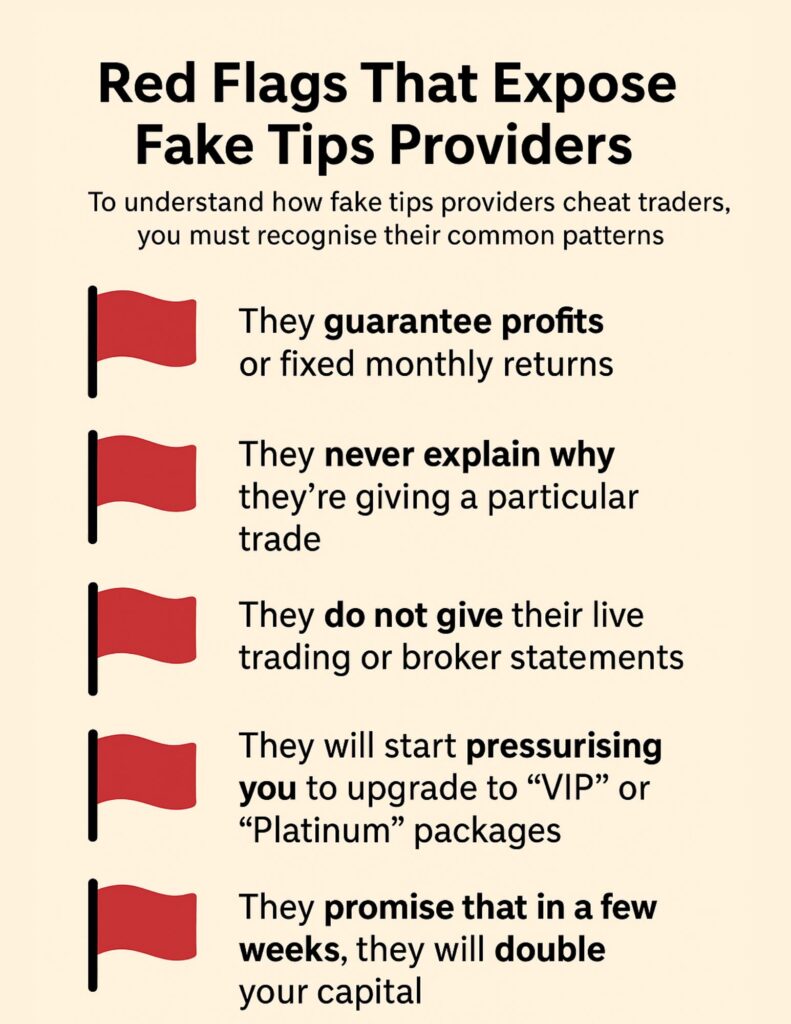 To understand How Fake Tips Providers Cheat Traders, you must recognise their common patterns. Here are some instant red flags: