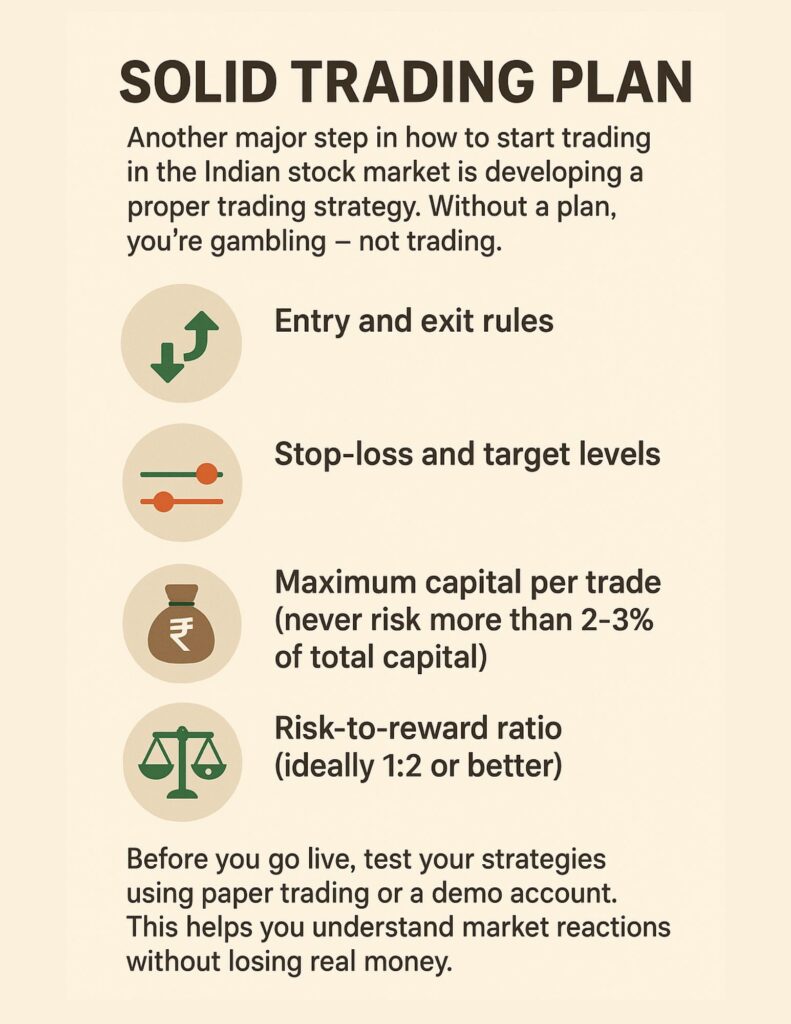 Another major step in how to start trading in the Indian stock market is the development of a proper trading strategy. Without a plan, you’re gambling, not trading.