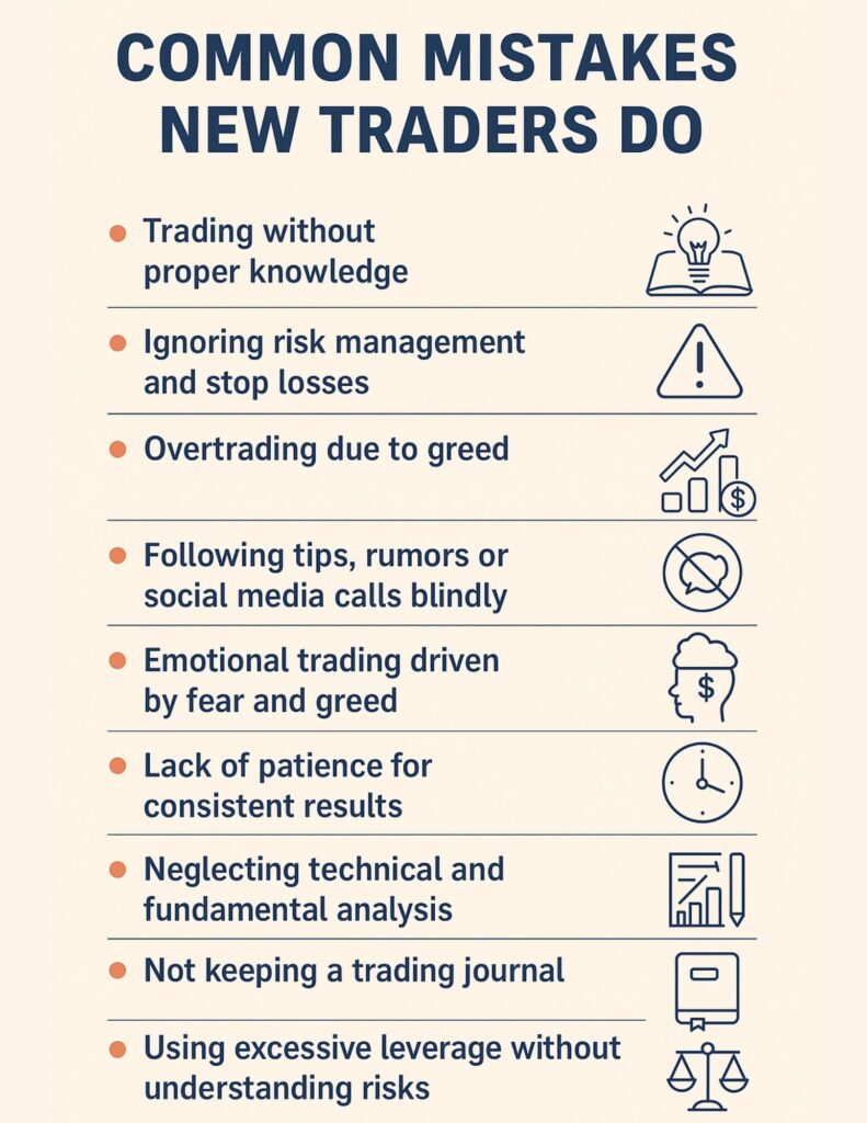 One of the largest Common Mistakes New Traders Do is jumping into the stock market without proper knowledge. Most people are tempted by profit displayed on social media or hearing testimonials from friends, and they start trading directly. Without learning technical analysis, market psychology, and risk management, trading is merely a game of chance.